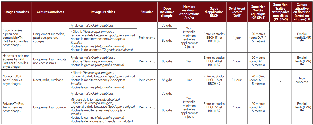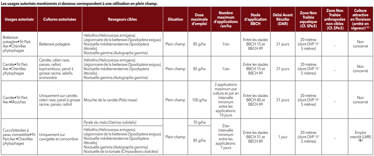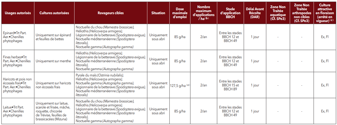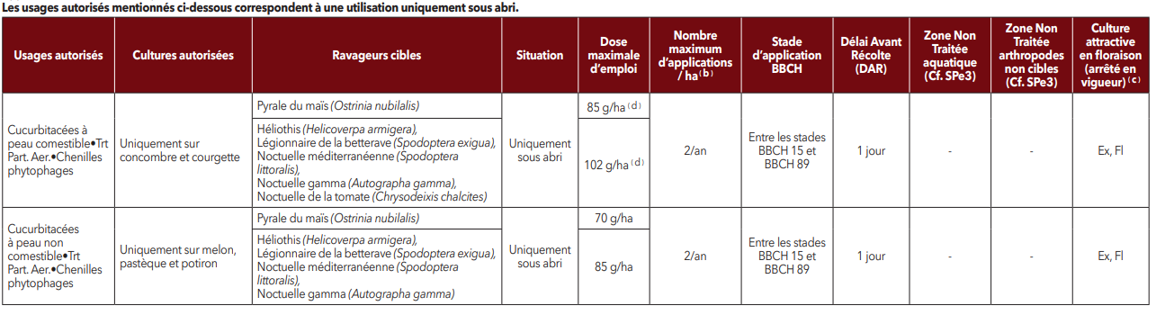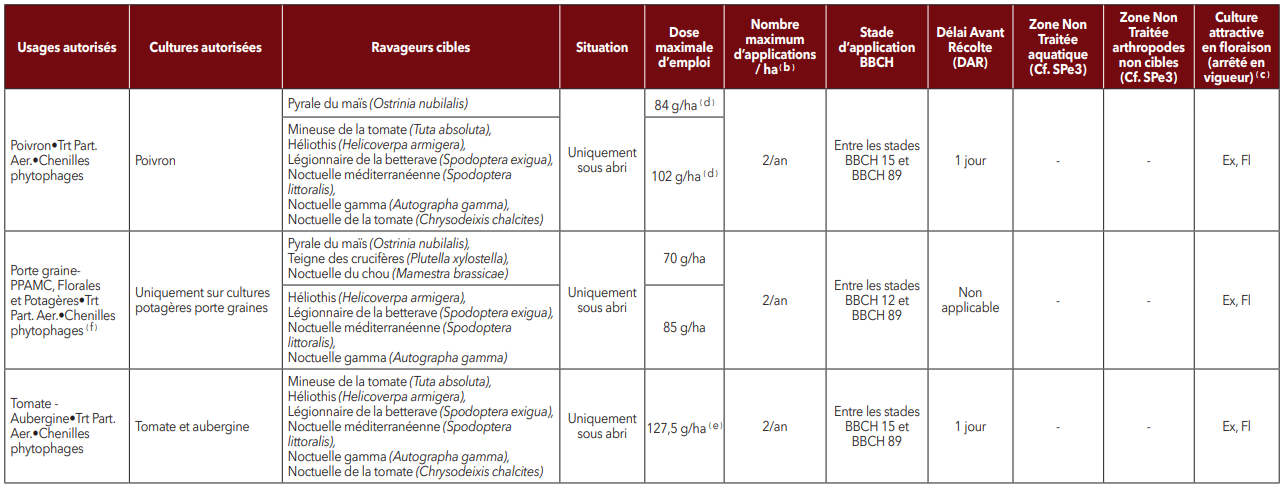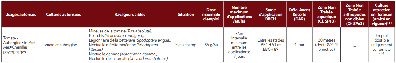 Le produit est uniquement homologué sur les cultures et sur les cibles mentionnées dans le tableau des usages autorisés ci-dessus (respectivement colonnes «Cultures autorisées» et «Ravageurs cibles») et n’est donc pas autorisé sur les autres cultures et cibles prévues par le catalogue des usages en vigueur.
